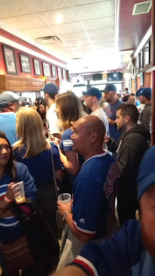 Of course, time was simultaneously creeping by and flying by as we watched college football, ate food, nursed light beer and water, and nervously chatted with the bartender and our new friends. The mood was tense, and there was legitimate fear that tomorrow might bring the chance to end the World Series we had all hoped for, but that it would be the Indians poised to win it all on the hollowed ground at Wrigley. Sometime in the afternoon "Go Cubs Go" came on the sound system in the bar, and for a moment the bar loosened up, as hundreds of Cubs fans, packed in together mere yards from Wrigley Field, sang in unison.
